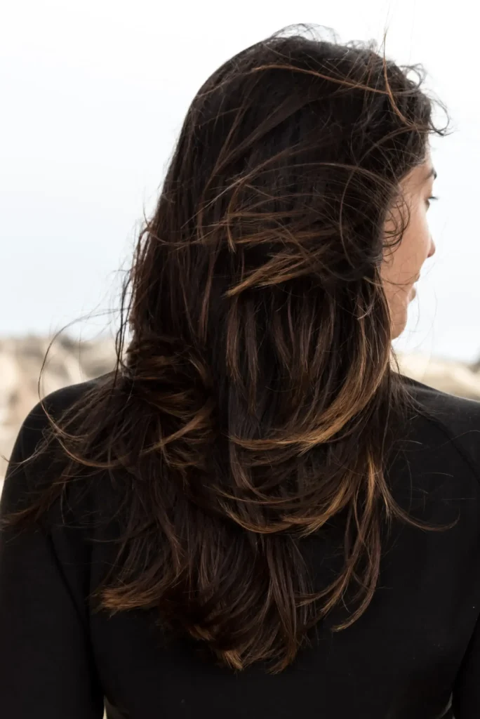 Técnica: se trabaja con babylights muy finas y un toner específico que unifica el tono. La clave está en la concentración de los reflejos en las capas superiores, dejando el interior más oscuro para crear dimensión.