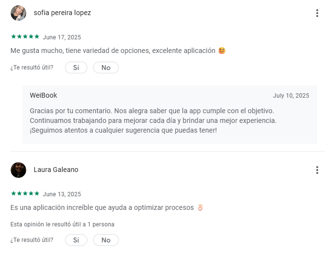 Existen diversas opiniones de WeiBook. En plataformas como Capterra o Google Play, algunos usuarios destacan la facilidad de uso.