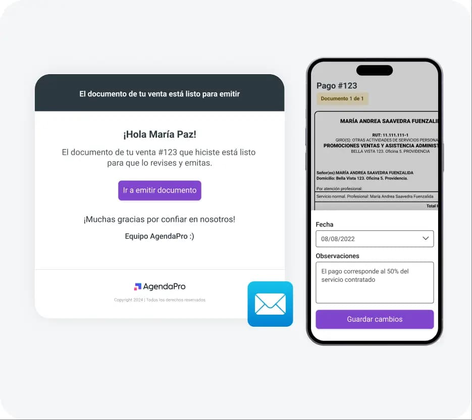 Podrás previsualizar el documento antes de emitirlo para verificar que esté todo bien y evites perder tiempo anulando documentos. Si prefieres relajarte y que AgendaPro se encargue, también puedes configurar la emisión automática de los documentos directo al mail de tu cliente.