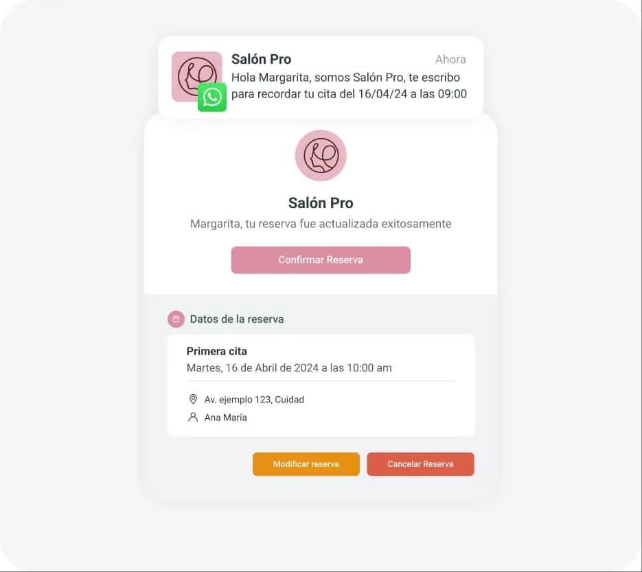 Envía recordatorios automáticos a tus clientes a través de WhatsApp, email o SMS para cada una de las reservas online realizadas en tu negocio.
