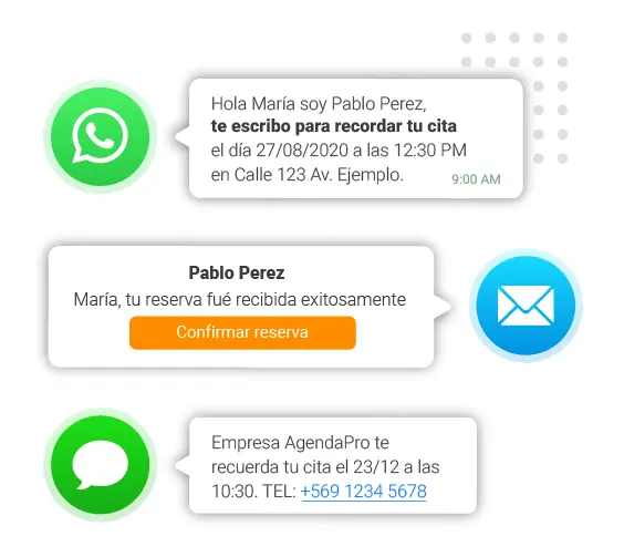 Envía recordatorios automáticos a tus clientes a través de WhatsApp, email o SMS para cada una de las reservas online realizadas en tu negocio.