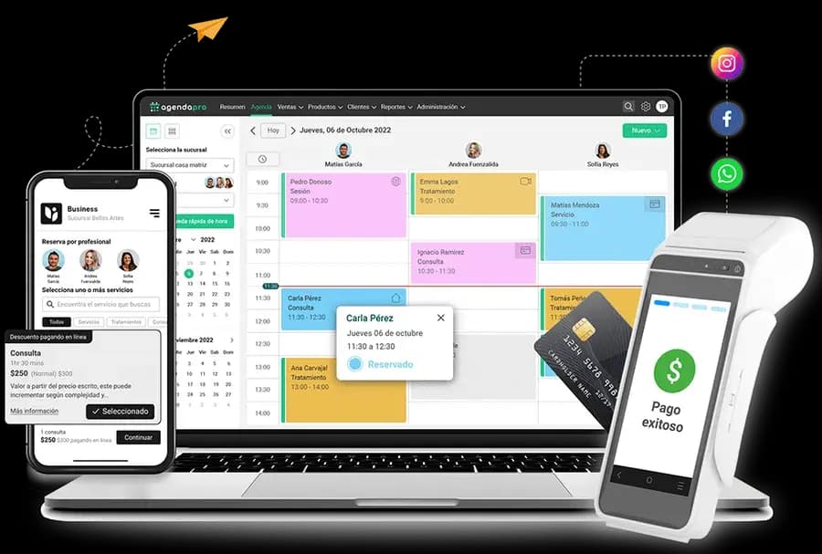 AgendaPro es la mejor opción para gestionar negocios que trabajan con agendamiento de citas. Te ofrecemos más de 30 funcionalidades, entre las que destacan, por supuesto, una agenda online disponible 24/7 para que los clientes reserven en cualquier momento, además de envío automático de recordatorios para que nadie falte a su cita.